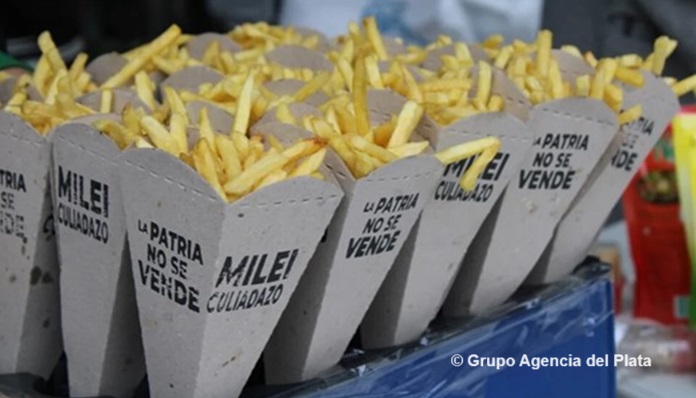 Los organizadores de la original movida se encomendaron a entregar a los transeúntes de la Plaza San Martín, esa que recibirá mañana al presidente para “festejar el Día de la Patria”, varios conos de papas fritas de forma gratuita. Los empaques llevaban escritas dos frases: la consigna “La Patria no se vende”, en referencia al frustrado Pacto de Mayo y al plan de gobierno de La Libertad Avanza en general; y el eslogan cordobés “Milei Culiadazo”, que también se transformó en tendencia en las redes sociales este viernes.