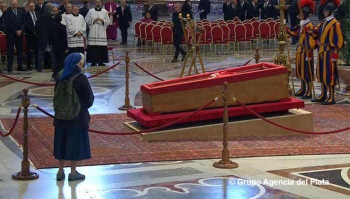 Los integrantes de la Iglesia fueron los primeros en ofrecer su saludo final al Papa Francisco, respetando un estricto protocolo de seguridad. Sor Geneviève no pasó desapercibida al pararse frente al féretro y quedarse inmóvil, rompiendo en llanto durante varios minutos. La «monja terrible» (81 años) fue amiga del Santo Padre y así la llamaba; forma parte de la Orden de las Hermanitas de Jesús y, es sobrina de Léonie Duquet, una de las monjas francesas secuestradas en Argentina durante la última dictadura cívico militar.