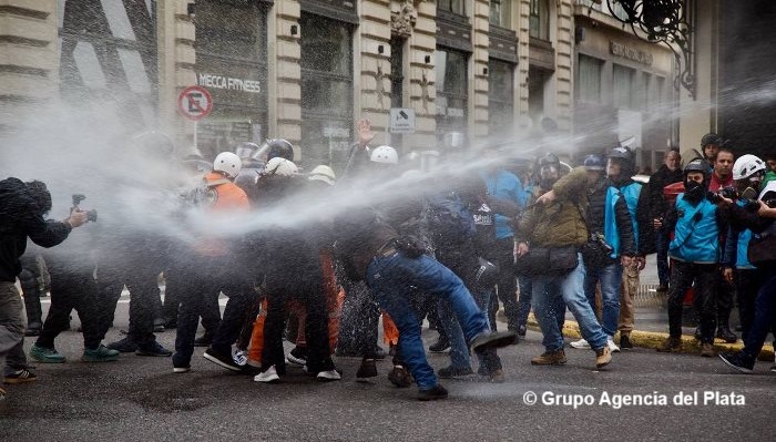 El fotógrafo Rodrigo Abd resultó herido. “El chorro justo me pega en la oreja y me tiró al piso”, dijo a los móviles de televisión que cubrían la protesta. “No escucho bien, porque el chorro es como un golpazo”, agregó.