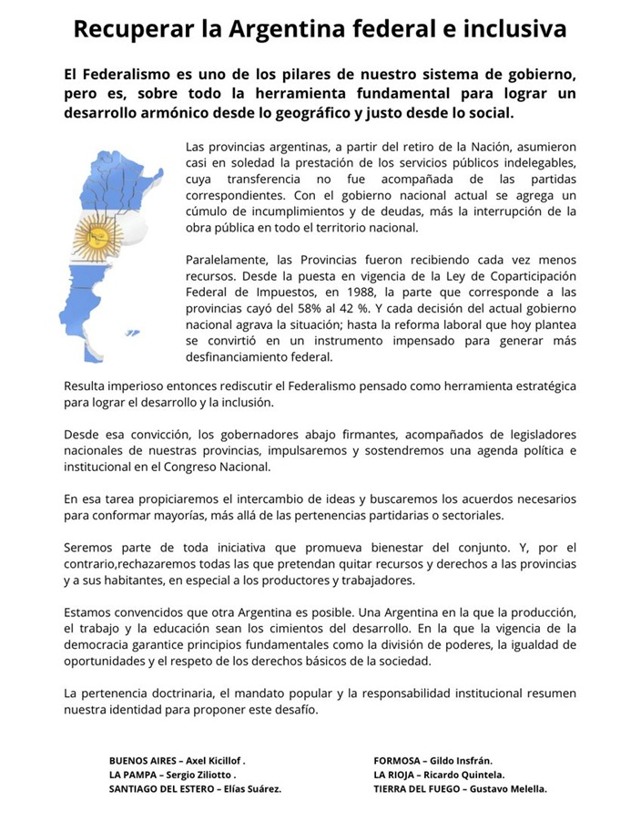 En el comunicado, los mandatarios sostuvieron que el federalismo constituye uno de los pilares del sistema de gobierno argentino, y remarcaron que resulta una herramienta clave para alcanzar un desarrollo equilibrado desde lo territorial y justo desde lo social.