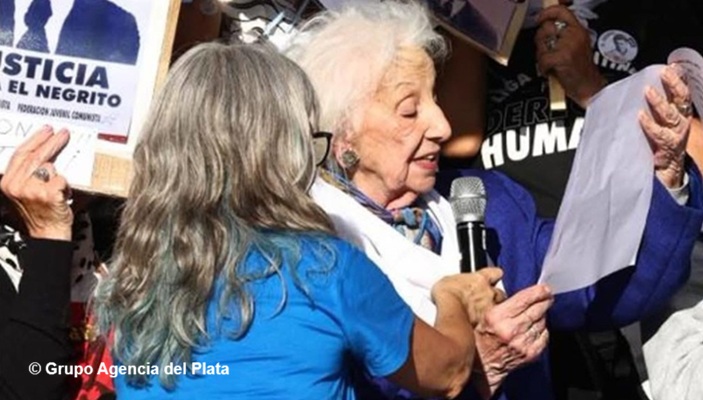Estamos en esta plaza, con los 30 mil como bandera, con las Madres y las Abuelas, con los sobrevivientes de los campos de concentración, con los hijos, hijas, los nietos y las nietas, hermanos y hermanas, con los familiares de los detenidos-desaparecidos, y con el conjunto de organismos de derechos humanos acompañados por el pueblo para decirle a Milei: la memoria es nuestra herramienta. Y para exigir ¡Que digan dónde están! A 50 años del golpe exigimos que los genocidas y sus cómplices den la información que ocultan. A pesar de los juicios, pruebas y condenas por sus crímenes, siguen sosteniendo el pacto de silencio.